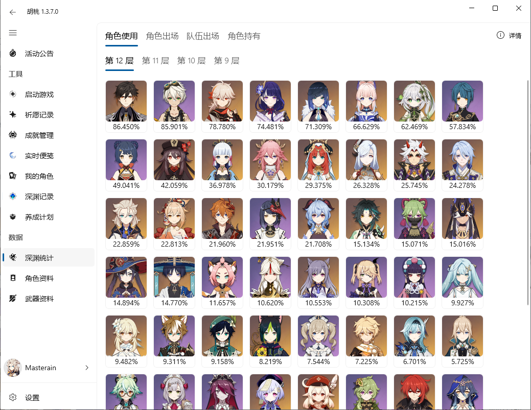 角色使用以查看角色使用率数据- 角色使用率 = 角色在当前层数出场次数1 / 持有该角色的玩家在该层数的总记录数