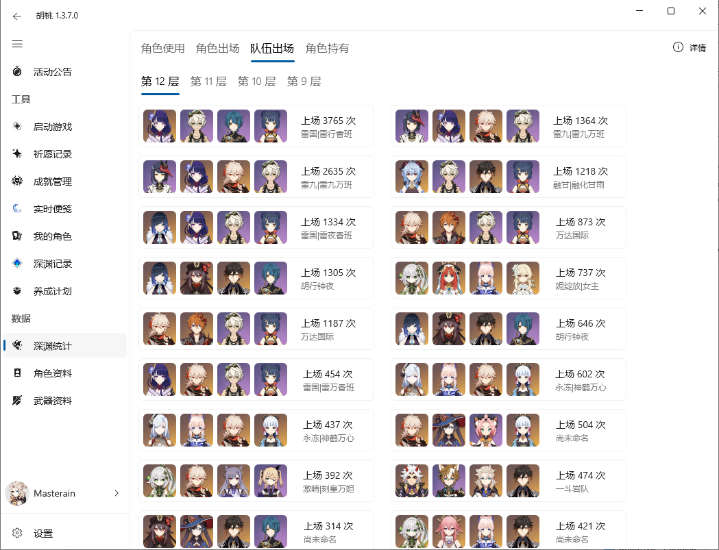 队伍出场以查看队伍组合出场次数数据- 各种角色组队情况下出场次数的排名
