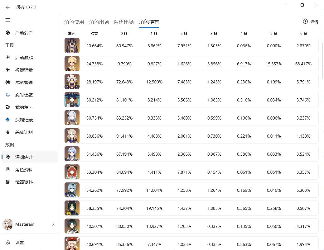 角色持有以查看角色持有率数据2- 角色持有率3 = 所有拥有该角色的玩家数量 / 全部玩家数量