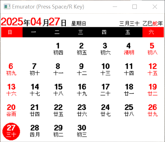 提示:R键切换黑白、三色,空格键切换日历时钟界面,上下键切换月份,左右键切换日期。