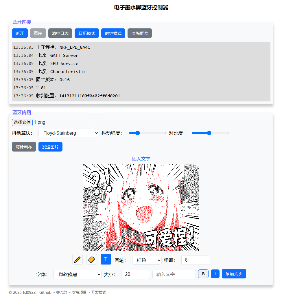 上位机支持多种图片抖动算法,且可以对图片进行涂鸦、添加文字。除了显示图片作为电子相框外,还可以切换到日历模式,显示月历、农历节气、节假日、放假调休等信息。