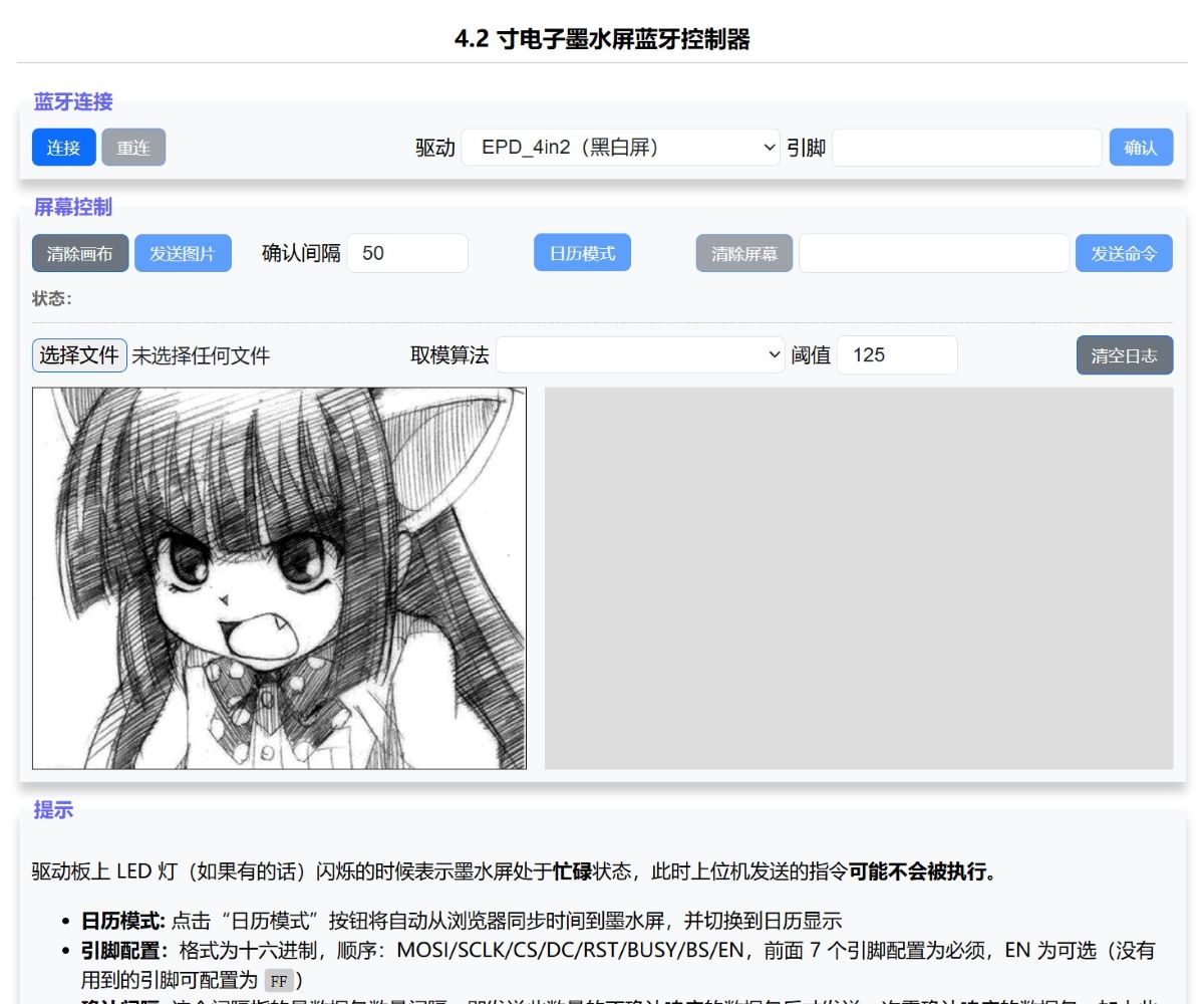 4.2 寸电子墨水屏固件,带有一个网页版上位机,可以通过蓝牙传输图像到墨水屏,也可以把墨水屏设置为日历模式(支持农历、节气)。