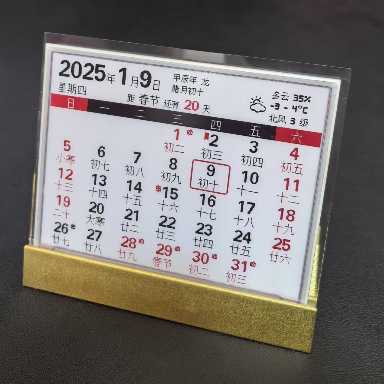 墨水屏日历,采用三色4.2寸墨水屏,展示基本月历信息,支持农历、公共假期、倒计日、天气(实时天气、每日天气)展示。