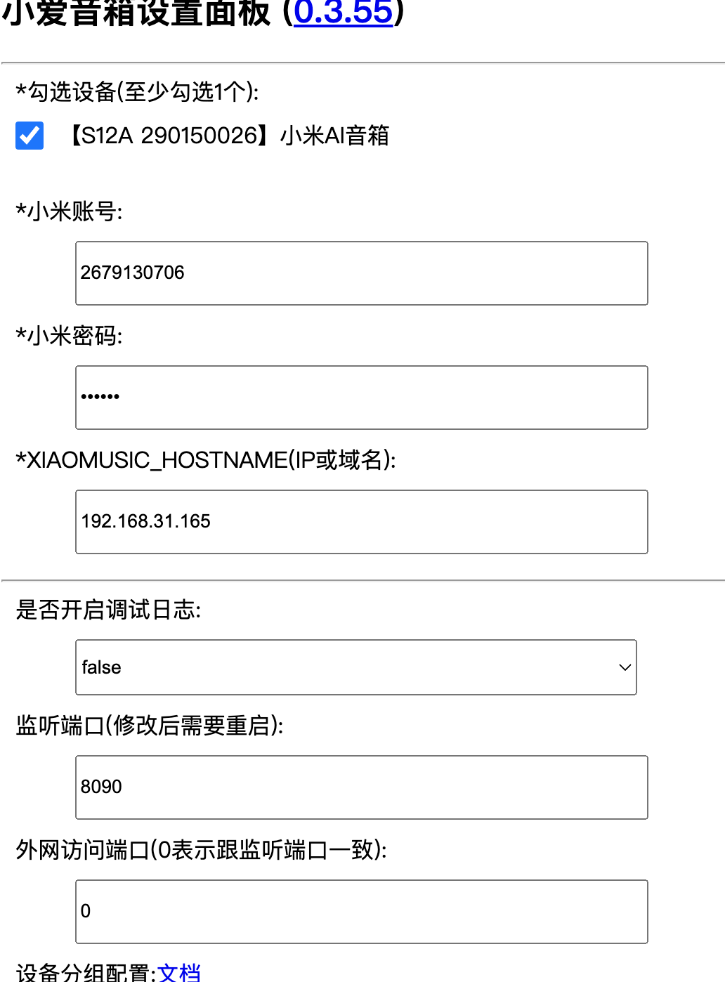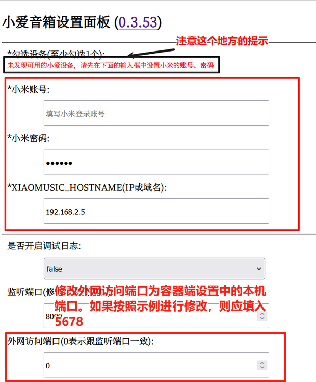 2. 输入小米账号小米密码XIAOMUSIC_HOSTNAME(IP或域名):外网访问端口,滑到页面最下方点击 保存 图片 图片
