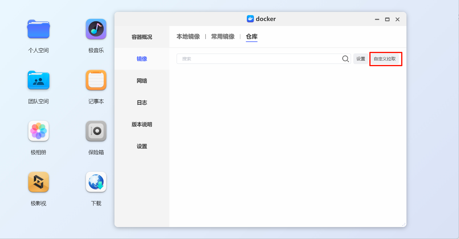 1. 打开docker在左侧的菜单中选择 镜像 切换到 仓库 选项卡,点击 自定义拉取 按钮 图片