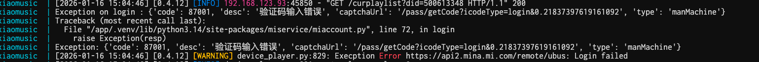 。。。。。。。。。 1Panel-xiaomusic-1n74 | [2026-01-17 13:06:46] [0.4.12] [INFO] device_player.py:226: play. names:['告白气球周杰伦'] 1 1Panel-xiaomusic-1n74 | [2026-01-17 13:06:46] [0.4.12] [INFO] device_player.py:912: cancel_group_next_timer {'981327057': <xiaomusic.device_player.XiaoMusicDevice object at 0xffff8f736780>} 1Panel-xiaomusic-1n74 | [2026-01-17 13:06:46] [0.4.12] [INFO] device_player.py:897: cancel_next_timer did: 981327057 1Panel-xiaomusic-1n74 | [2026-01-17 13:06:46] [0.4.12] [INFO] device_player.py:907: 下一曲定时器不见了 did: 981327057 1Panel-xiaomusic-1n74 | [2026-01-17 13:06:46] [0.4.12] [INFO] device_player.py:357: cur_music 告白气球周杰伦 1Panel-xiaomusic-1n74 | [2026-01-17 13:06:46] [0.4.12] [INFO] music_url.py:60: get_music_url name:告白气球周杰伦 1Panel-xiaomusic-1n74 | [2026-01-17 13:06:46] [0.4.12] [INFO] music_library.py:586: try get_filename. filename:music/download/告白气球周杰伦.mp3 1Panel-xiaomusic-1n74 | [2026-01-17 13:06:46] [0.4.12] [INFO] music_url.py:139: _get_local_music_url local music. name:告白气球周杰伦, filename:music/download/告白气球周杰伦.mp3 1Panel-xiaomusic-1n74 | [2026-01-17 13:06:46] [0.4.12] [INFO] music_url.py:162: _get_file_url filepath:music/download/告白气球周杰伦.mp3, filename:download/告白气球周杰伦.mp3 1Panel-xiaomusic-1n74 | [2026-01-17 13:06:46] [0.4.12] [INFO] music_url.py:53: get_music_sec_url. name:告白气球周杰伦 url:http://192.168.6.167:58090/music/download/%E5%91%8A%E7%99%BD%E6%B0%94%E7%90%83%E5%91%A8%E6%9D%B0%E4%BC%A6.mp3 origin_url:None 1Panel-xiaomusic-1n74 | [2026-01-17 13:06:46] [0.4.12] [INFO] device_player.py:872: group_force_stop_xiaoai Xiaomi 智能音箱 Pro ['70ba747b-af44-4e41-bc49-b9da586cf770'] 1Panel-xiaomusic-1n74 | Exception on login 2340782246: {'code': 87001, 'desc': '验证码输入错误', 'captchaUrl': '/pass/getCode?icodeType=login&0.754211913663798', 'type': 'manMachine'} 1Panel-xiaomusic-1n74 | Traceback (most recent call last): 1Panel-xiaomusic-1n74 | File "/app/.venv/lib/python3.14/site-packages/miservice/miaccount.py", line 72, in login 1Panel-xiaomusic-1n74 | raise Exception(resp) 1Panel-xiaomusic-1n74 | Exception: {'code': 87001, 'desc': '验证码输入错误', 'captchaUrl': '/pass/getCode?icodeType=login&0.754211913663798', 'type': 'manMachine'} 1Panel-xiaomusic-1n74 | [2026-01-17 13:06:47] [0.4.12] [WARNING] device_player.py:424: Execption Error https://api2.mina.mi.com/remote/ubus: Login failed 1Panel-xiaomusic-1n74 | [2026-01-17 13:06:47] [0.4.12] [INFO] device_player.py:875: group_force_stop_xiaoai ['70ba747b-af44-4e41-bc49-b9da586cf770'] [None] 1Panel-xiaomusic-1n74 | [2026-01-17 13:06:47] [0.4.12] [INFO] device_player.py:362: 播放 http://192.168.6.167:58090/music/download/%E5%91%8A%E7%99%BD%E6%B0%94%E7%90%83%E5%91%A8%E6%9D%B0%E4%BC%A6.mp31Panel-xiaomusic-1n74 | Exception on login 2340782246: {'code': 87001, 'desc': '验证码输入错误', 'captchaUrl': '/pass/getCode?icodeType=login&0.38010189998178023', 'type': 'manMachine'} 1Panel-xiaomusic-1n74 | Traceback (most recent call last): 1Panel-xiaomusic-1n74 | File "/app/.venv/lib/python3.14/site-packages/miservice/miaccount.py", line 72, in login 1Panel-xiaomusic-1n74 | raise Exception(resp) 1Panel-xiaomusic-1n74 | Exception: {'code': 87001, 'desc': '验证码输入错误', 'captchaUrl': '/pass/getCode?icodeType=login&0.38010189998178023', 'type': 'manMachine'} 1Panel-xiaomusic-1n74 | [2026-01-17 13:06:47] [0.4.12] [ERROR] device_player.py:730: Execption Error https://api2.mina.mi.com/remote/ubus: Login failed 1Panel-xiaomusic-1n74 | Traceback (most recent call last): 1Panel-xiaomusic-1n74 | File "/app/xiaomusic/device_player.py", line 718, in play_one_url 1Panel-xiaomusic-1n74 | ret = await self.auth_manager.mina_service.play_by_music_url( 1Panel-xiaomusic-1n74 | ^^^^^^^^^^^^^^^^^^^^^^^^^^^^^^^^^^^^^^^^^^^^^^^^^^^^^^^ 1Panel-xiaomusic-1n74 | device_id, url, audio_id=audio_id 1Panel-xiaomusic-1n74 | ^^^^^^^^^^^^^^^^^^^^^^^^^^^^^^^^^ 1Panel-xiaomusic-1n74 | ) 1Panel-xiaomusic-1n74 | ^ 1Panel-xiaomusic-1n74 | File "/app/.venv/lib/python3.14/site-packages/miservice/minaservice.py", line 206, in play_by_music_url 1Panel-xiaomusic-1n74 | return await self.ubus_request( 1Panel-xiaomusic-1n74 | ^^^^^^^^^^^^^^^^^^^^^^^^ 1Panel-xiaomusic-1n74 | ...<4 lines>... 1Panel-xiaomusic-1n74 | ) 1Panel-xiaomusic-1n74 | ^ 1Panel-xiaomusic-1n74 | File "/app/.venv/lib/python3.14/site-packages/miservice/minaservice.py", line 47, in ubus_request 1Panel-xiaomusic-1n74 | result = await self.mina_request( 1Panel-xiaomusic-1n74 | ^^^^^^^^^^^^^^^^^^^^^^^^ 1Panel-xiaomusic-1n74 | ...<2 lines>... 1Panel-xiaomusic-1n74 | ) 1Panel-xiaomusic-1n74 | ^ 1Panel-xiaomusic-1n74 | File "/app/.venv/lib/python3.14/site-packages/miservice/minaservice.py", line 37, in mina_request 1Panel-xiaomusic-1n74 | return await self.account.mi_request( 1Panel-xiaomusic-1n74 | ^^^^^^^^^^^^^^^^^^^^^^^^^^^^^^ 1Panel-xiaomusic-1n74 | "micoapi", "https://api2.mina.mi.com" + uri, data, headers 1Panel-xiaomusic-1n74 | ^^^^^^^^^^^^^^^^^^^^^^^^^^^^^^^^^^^^^^^^^^^^^^^^^^^^^^^^^^ 1Panel-xiaomusic-1n74 | ) 1Panel-xiaomusic-1n74 | ^ 1Panel-xiaomusic-1n74 | File "/app/.venv/lib/python3.14/site-packages/miservice/miaccount.py", line 155, in mi_request 1Panel-xiaomusic-1n74 | raise Exception(f"Error {url}: {resp}") 1Panel-xiaomusic-1n74 | Exception: Error https://api2.mina.mi.com/remote/ubus: Login failed 1Panel-xiaomusic-1n74 | [2026-01-17 13:06:47] [0.4.12] [INFO] device_player.py:700: group_player_play http://192.168.6.167:58090/music/download/%E5%91%8A%E7%99%BD%E6%B0%94%E7%90%83%E5%91%A8%E6%9D%B0%E4%BC%A6.mp3 ['70ba747b-af44-4e41-bc49-b9da586cf770'] [None] 1Panel-xiaomusic-1n74 | [2026-01-17 13:06:47] [0.4.12] [INFO] device_player.py:366: 播放 告白气球周杰伦 失败. 失败次数: 10 1Panel-xiaomusic-1n74 | [2026-01-17 13:06:48] [0.4.12] [INFO] 192.168.6.205:2582 - "POST /playmusiclist HTTP/1.1" 200 。。。。